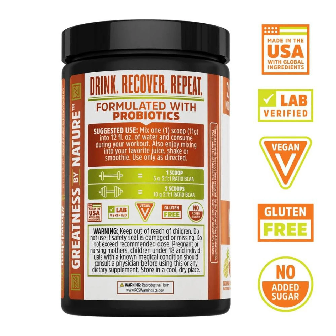- Features 5000mg of Vegan BCAAs along with Vitamin C, Probiotics and More